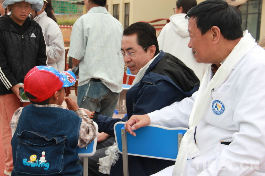 圖為航空總醫(yī)院泌尿外科主任李文華與航天中心醫(yī)院泌尿外科主任李垂青(右一)在甘孜州康北兒童福利院與小朋友交談 攝影:劉莉