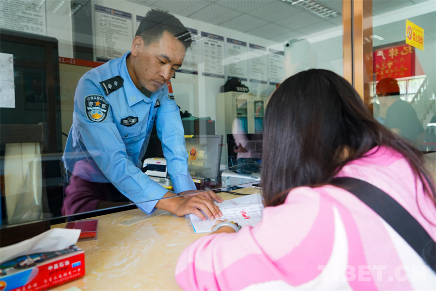 圖為移民管理警察丹增永鋒正在辦理窗口業(yè)務 攝影:趙振宇