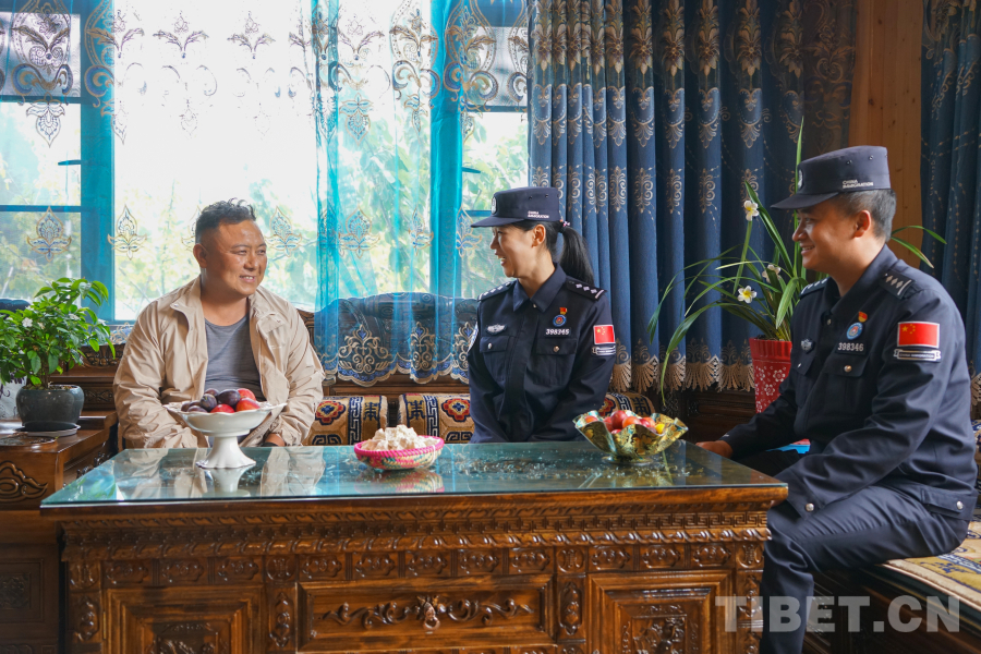 圖為羌納邊境派出所移民管理警察封碩和李冬雪向 村民白瑪丁增了解近況 攝影:趙振宇