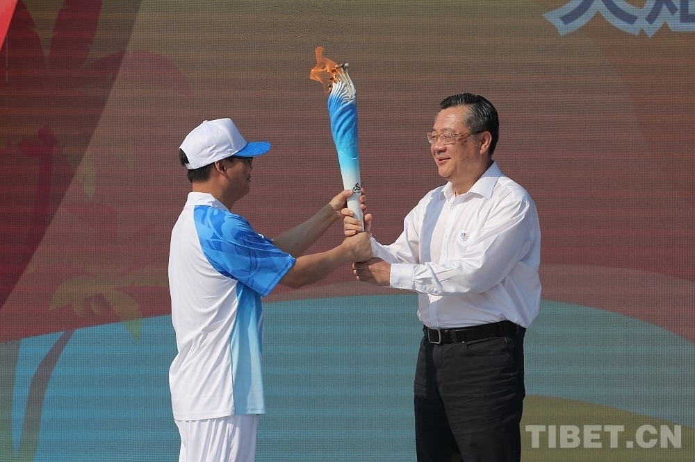 圖為國家民委副主任郭衛(wèi)平(右)將火炬?zhèn)鹘o第一棒火炬手徐洪周 攝影:民族畫報 滕俊 趙利