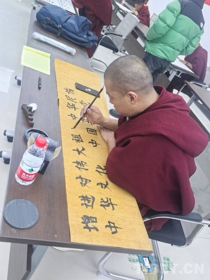 僧尼們現(xiàn)場(chǎng)創(chuàng)作了國(guó)家通用語言文字書法作品17幅、藏文書法作品21幅,涵蓋鑄牢中華民族共同體意識(shí)及“鄉(xiāng)村振興 那曲奮進(jìn)”等內(nèi)容,充分展現(xiàn)了寺廟僧尼對(duì)黨、對(duì)祖國(guó)、對(duì)社會(huì)主義的熱愛和堅(jiān)定信仰。