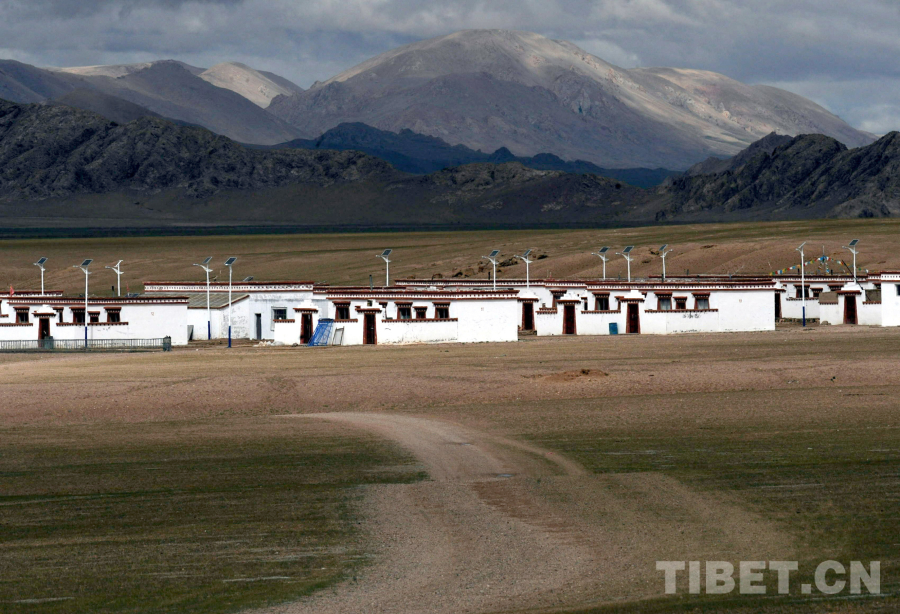這是中國海油為尼瑪縣俄久鄉(xiāng)牧民所援建的安居房,高高的立桿是太陽能照明路燈(唐召明2007年8月18日攝)