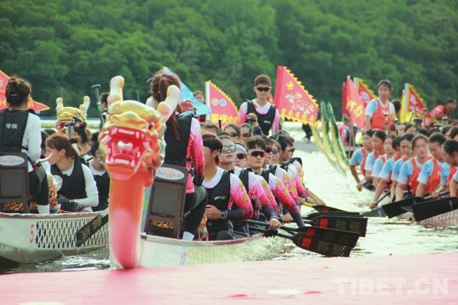 圖為第十二屆全國少數(shù)民族傳統(tǒng)體育運動會龍舟項目各參賽隊蓄勢待發(fā) 攝影:劉莉