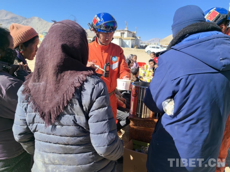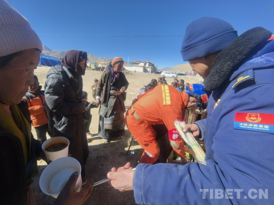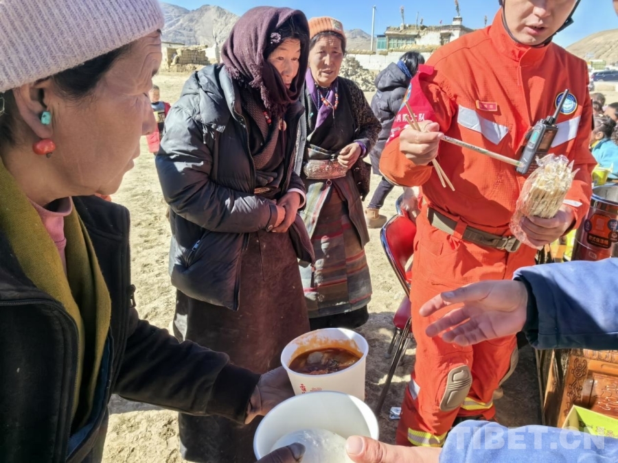 圖為拉薩森林消防大隊救援人員正在為定日縣曲洛鄉(xiāng)措昂村受災(zāi)群眾分發(fā)熱乎乎的燉菜和饅頭 拉薩森林消防大隊供圖