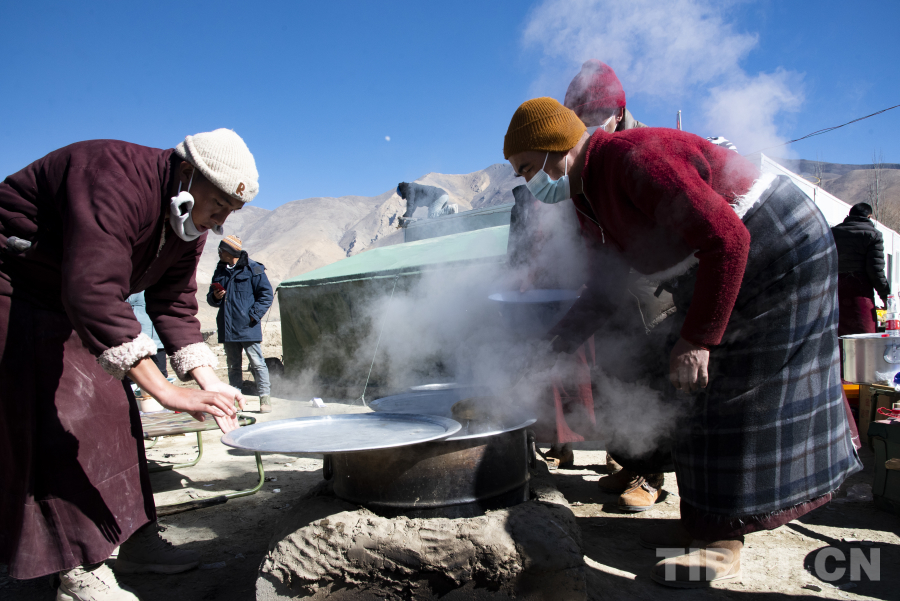 圖為宗布寺和森嘎曲德寺受災(zāi)僧尼正在燒水做飯 攝影:趙振宇