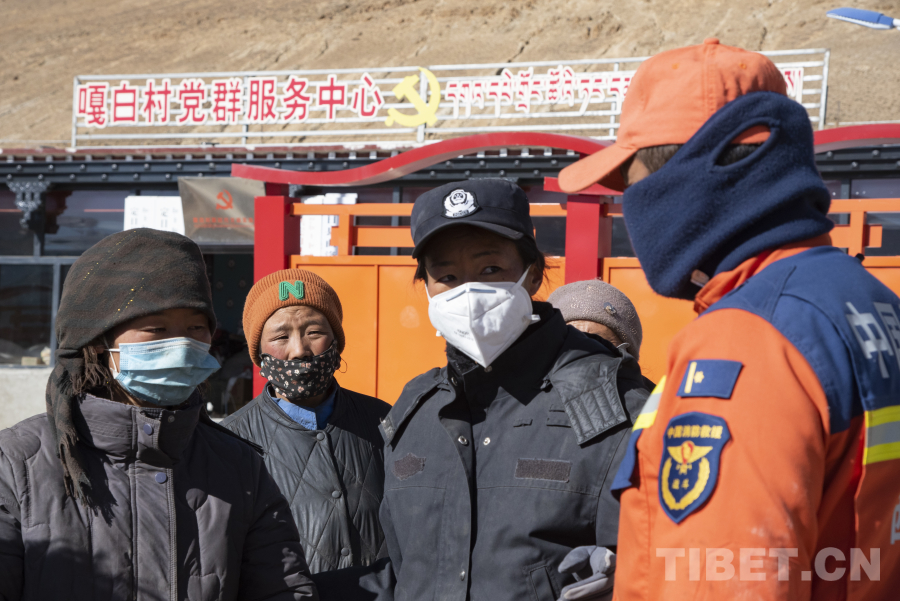 圖為頓珠巴姆(左三)正與消防員向受災(zāi)群眾講解防火事項(xiàng) 攝影:趙振宇