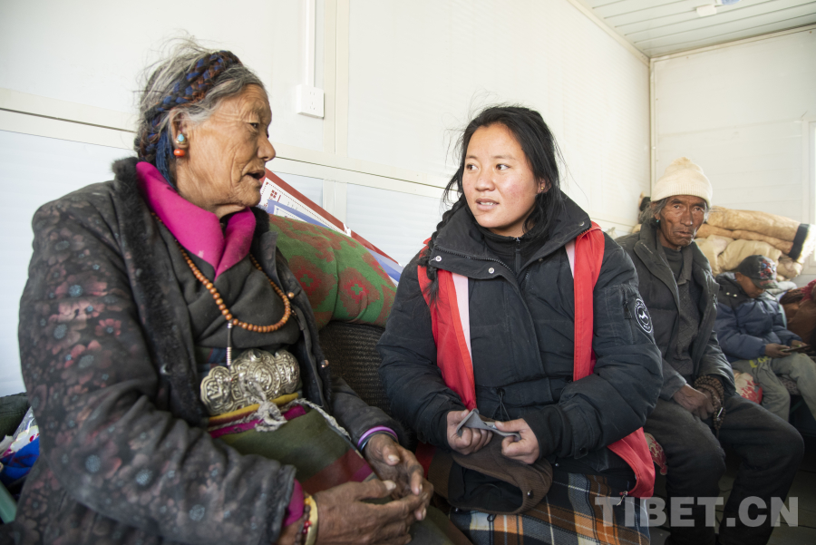 圖為次仁玉珍(左二)正在安置點(diǎn)內(nèi)了解受災(zāi)群眾情況 攝影:趙振宇