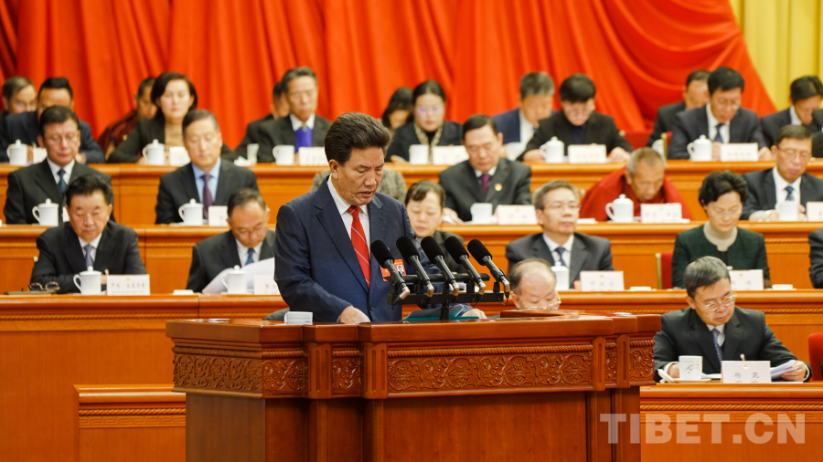 圖為洛桑江村受西藏自治區(qū)人大常委會委托作西藏自治區(qū)人民代表大會常務(wù)委員會工作報告 攝影:趙振宇