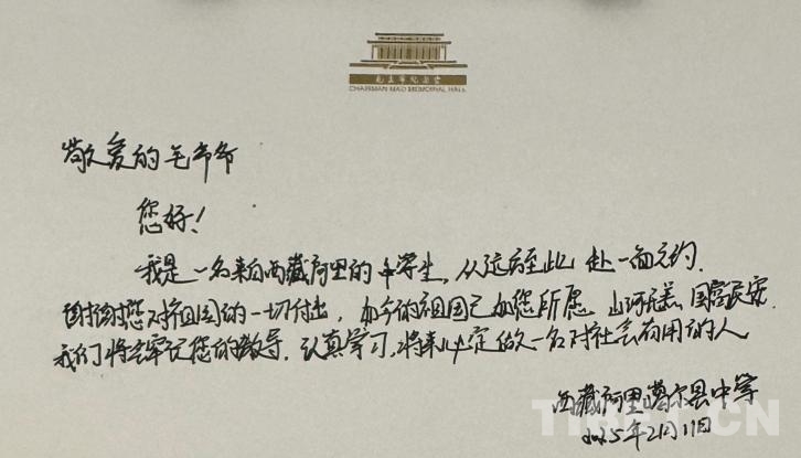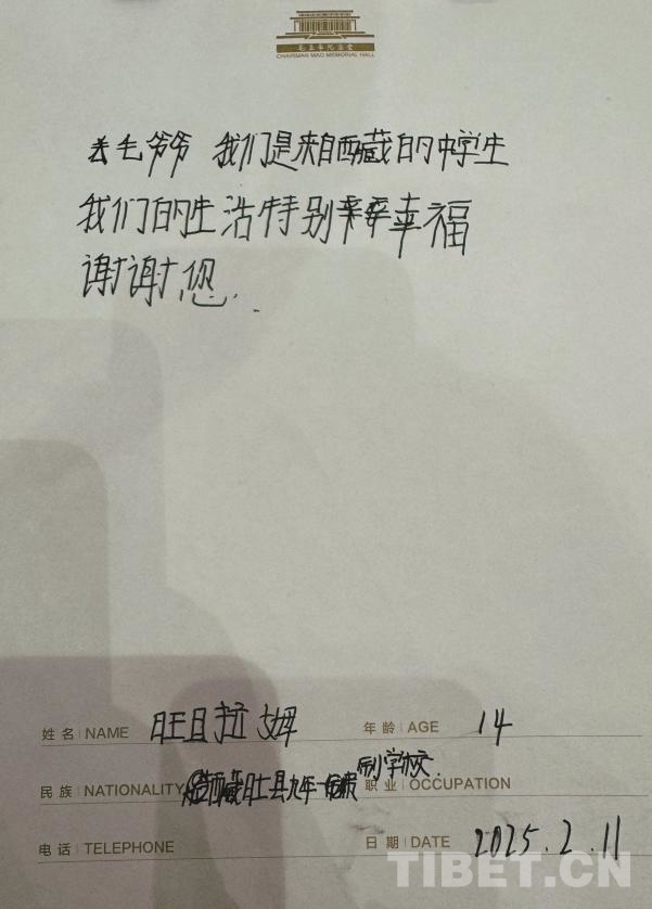 “敬愛的毛爺爺,您好!我是一名來自西藏阿里的中學生。從遠方至此,赴一面之約。謝謝您對祖國的一切付出。如今的祖國如您所愿,山河無恙,國泰民安。我們將牢記您的教導,認真學習,將來必定做一名對社會有用的人!”