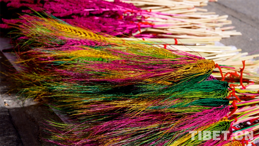 在藏歷新年年貨物品中,提及酥油花就不得不提它的“搭檔”“羅薩梅朵”,正是因?yàn)樗鼈兊难b點(diǎn)讓藏歷新年中本身就已很精致的“切瑪盒”更加亮眼?!傲_薩梅朵”被稱為“冬季里最美麗的花”,是經(jīng)過(guò)染色的麥穗和青稞穗制作成的“花卉”。在藏歷新年或節(jié)日之時(shí),人們將其插在盛滿糌粑和青稞的“切瑪盒”上,寓意新的一年美滿、豐收。