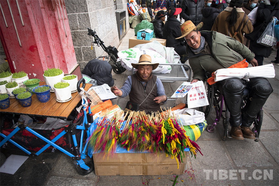 普瓊,來(lái)自日喀則市江孜縣,在八廓商城南門前經(jīng)營(yíng)著自己的“羅薩梅朵”小攤。初見(jiàn)普瓊,我們被他沖著鏡頭的燦爛笑容所吸引。細(xì)細(xì)觀察,普瓊坐在地上的身高卻比別人矮了一大截。“我們從拉薩堆龍德慶的批發(fā)市場(chǎng)上買來(lái)這批‘羅薩梅朵’在此銷售,就希望能夠在年前的這段時(shí)間多賺些小錢補(bǔ)貼家用,所有人都想在新年之時(shí)過(guò)個(gè)充裕的‘好年’,不是嗎?”普瓊因一次意外高位截癱,失去雙腿的他并沒(méi)有消沉。他選擇積極面對(duì)生活,用自己的雙手和命運(yùn)抗?fàn)帲脠?jiān)強(qiáng)和勤勞讓自己和全家過(guò)上更好的生活。與普瓊不幸的經(jīng)歷相比,我們每個(gè)人過(guò)的每個(gè)年何嘗不都是一個(gè)個(gè)“好年”呢?普瓊對(duì)生活的那種熱愛(ài),對(duì)明天會(huì)更好的堅(jiān)定,何嘗不是我們對(duì)每一個(gè)“好年”所孜孜追求的呢?