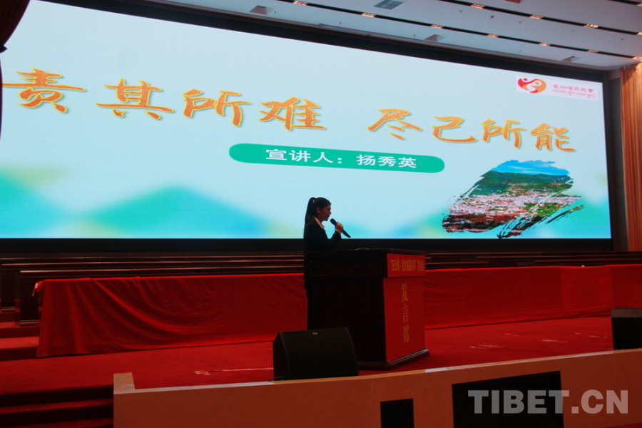 圖為攀枝花市農(nóng)業(yè)農(nóng)村局干部揚(yáng)秀英講述該局黨組成員、副局長寧秀蓉的援藏故事 攝影:劉莉