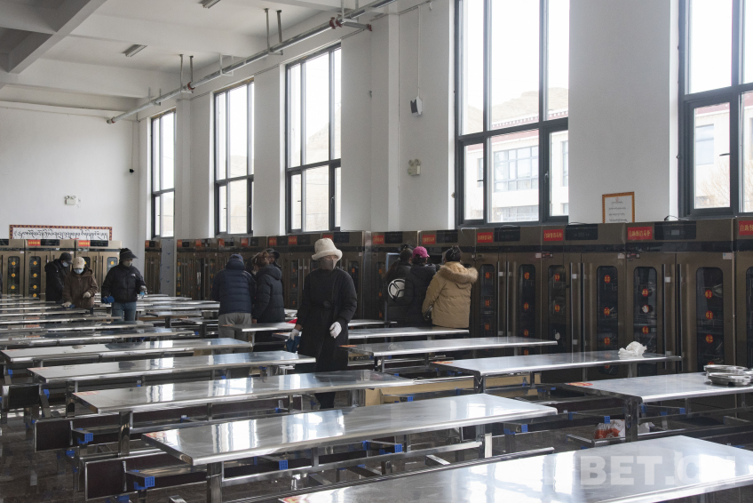 圖為長所鄉(xiāng)完全小學(xué)集中安置辦學(xué)點(diǎn)內(nèi)新規(guī)劃的學(xué)生食堂,教職工們正在清理食堂衛(wèi)生。 攝影:趙振宇