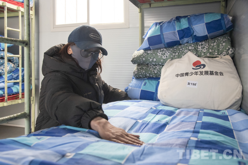 圖為長所鄉(xiāng)完全小學(xué)教師次旦卓嘎正在學(xué)生板房宿舍內(nèi)為學(xué)生整理床鋪 攝影:趙振宇