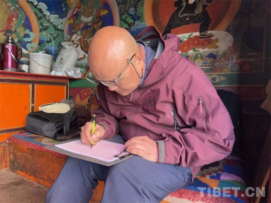 圖為羅文華在薩迦寺內(nèi)認(rèn)真測(cè)繪 攝影:王妍丹