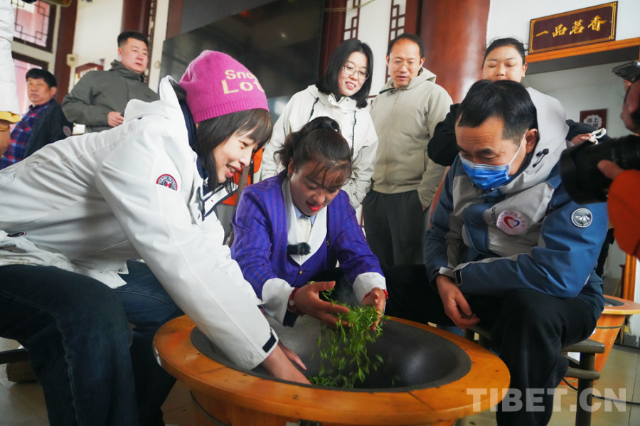 圖為羅布央宗(中)和醫(yī)療志愿者一起炒茶 攝影:王茜