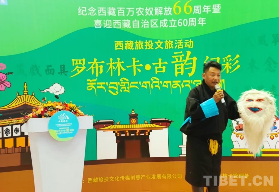 圖為3月30日在拉薩羅布林卡舉辦的“羅布林卡·古韻幻彩”活動(dòng)中,藏戲傳承者講述藏戲面具的故事 攝影:趙釗