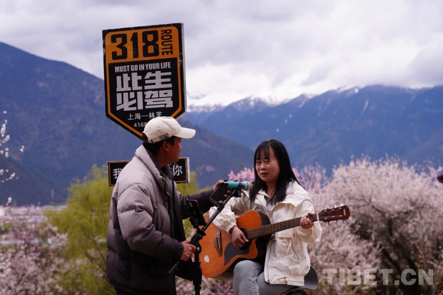 桃花樹下,沿著階梯往觀景臺方向走去,“此生必駕318”打卡路牌十分醒目,游客坐在一旁的座椅上拿起吉他,對著話筒深情歌唱,遠處皚皚雪山與茂密的森林,近處粉白相間的桃花和金燦燦的油菜花構(gòu)成一幅壯美畫卷,讓游客沉醉在歌聲與美景中,苑寶錄正忙著將這一瞬間拍攝記錄。