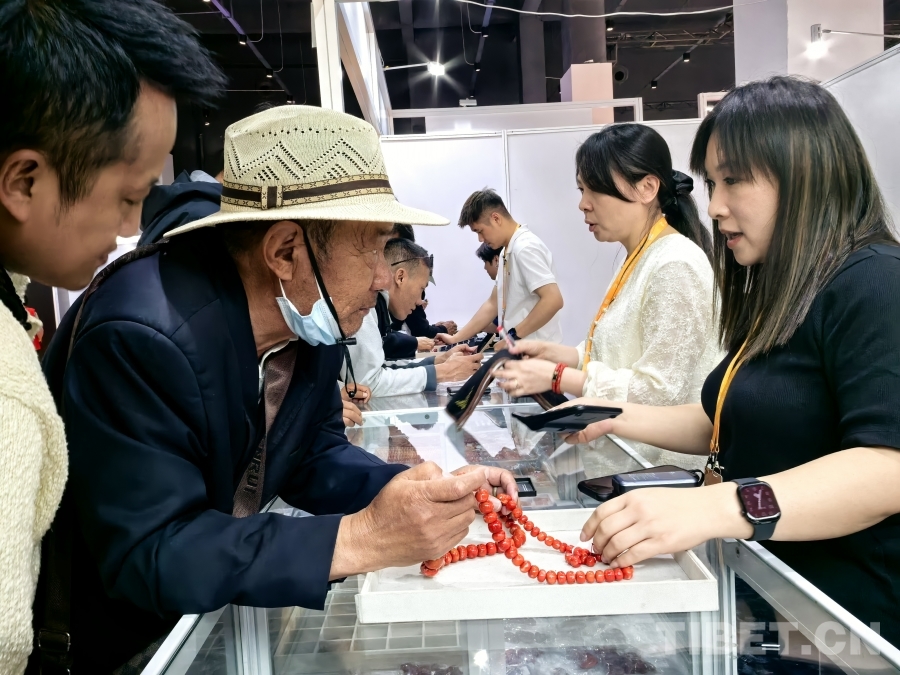 圖為5月16日第二屆拉薩進(jìn)口商品展覽會上,顧客在咨詢珊瑚飾品價(jià)格 攝影:王淑