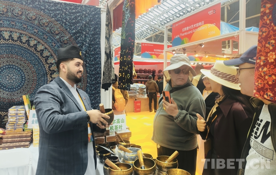 圖為5月16日,第二屆拉薩進(jìn)口商品展覽會上,尼泊爾商人向顧客演示如何敲擊頌缽 攝影:趙釗