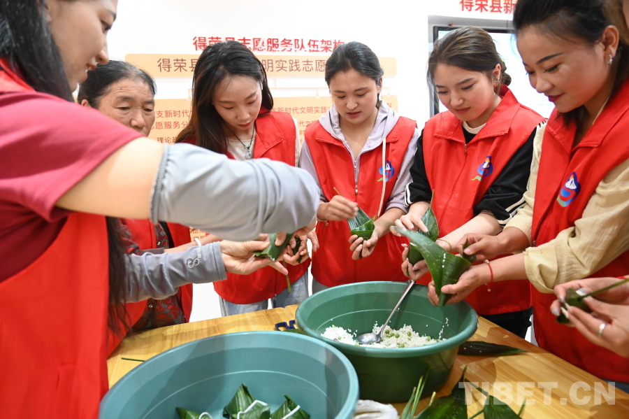 圖為得榮縣志愿服務(wù)隊在包粽子