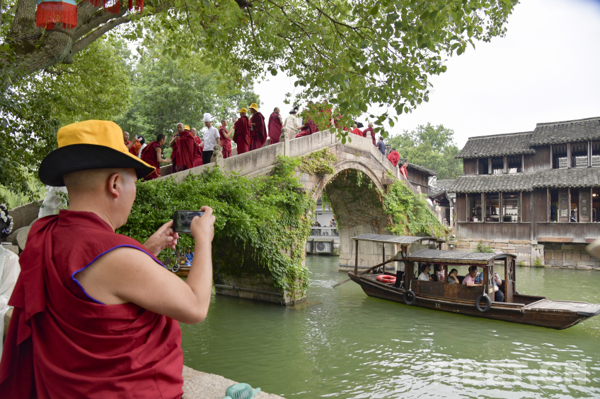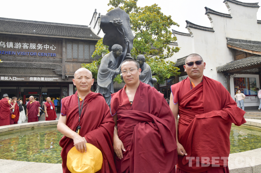 圖為在烏鎮(zhèn)西柵景區(qū)寒山拾得雕塑前西藏佛學(xué)院師生留下合影 攝影:趙振宇