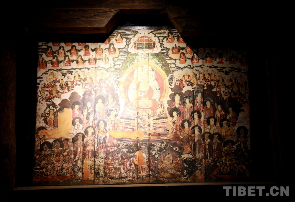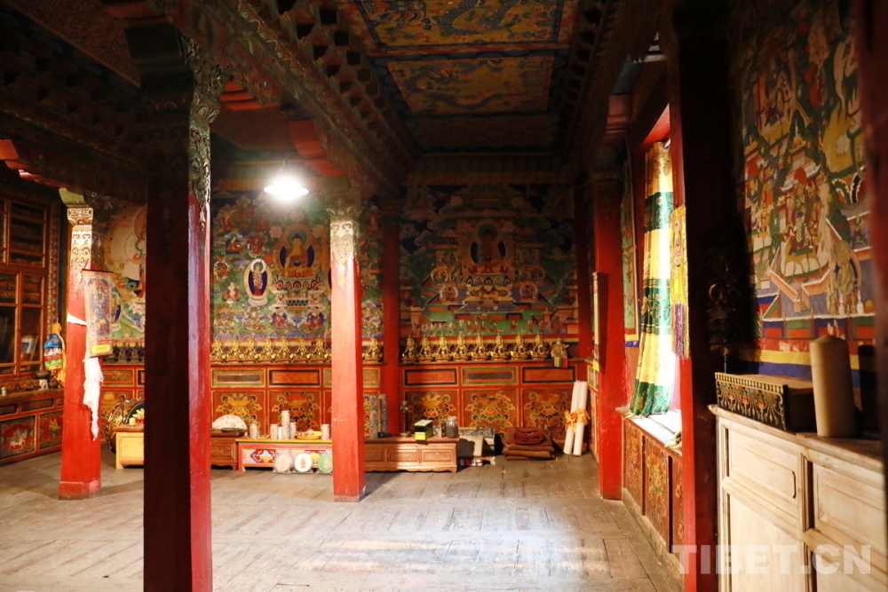 宗薩木府最驚艷的是其經(jīng)堂中歷經(jīng)380余年歷史仍色彩絢麗、保存完整的整堂壁畫。新中國成立后,宗薩木府曾被收歸公有,許多無房的當(dāng)?shù)刎毨罕姳话才抛∵M(jìn)了這里?!拔母铩睍r期,宗薩木府的經(jīng)堂被作為村里的倉庫,人們用報紙糊住壁畫,使這些藝術(shù)珍品沒有受到“破四舊”的影響。