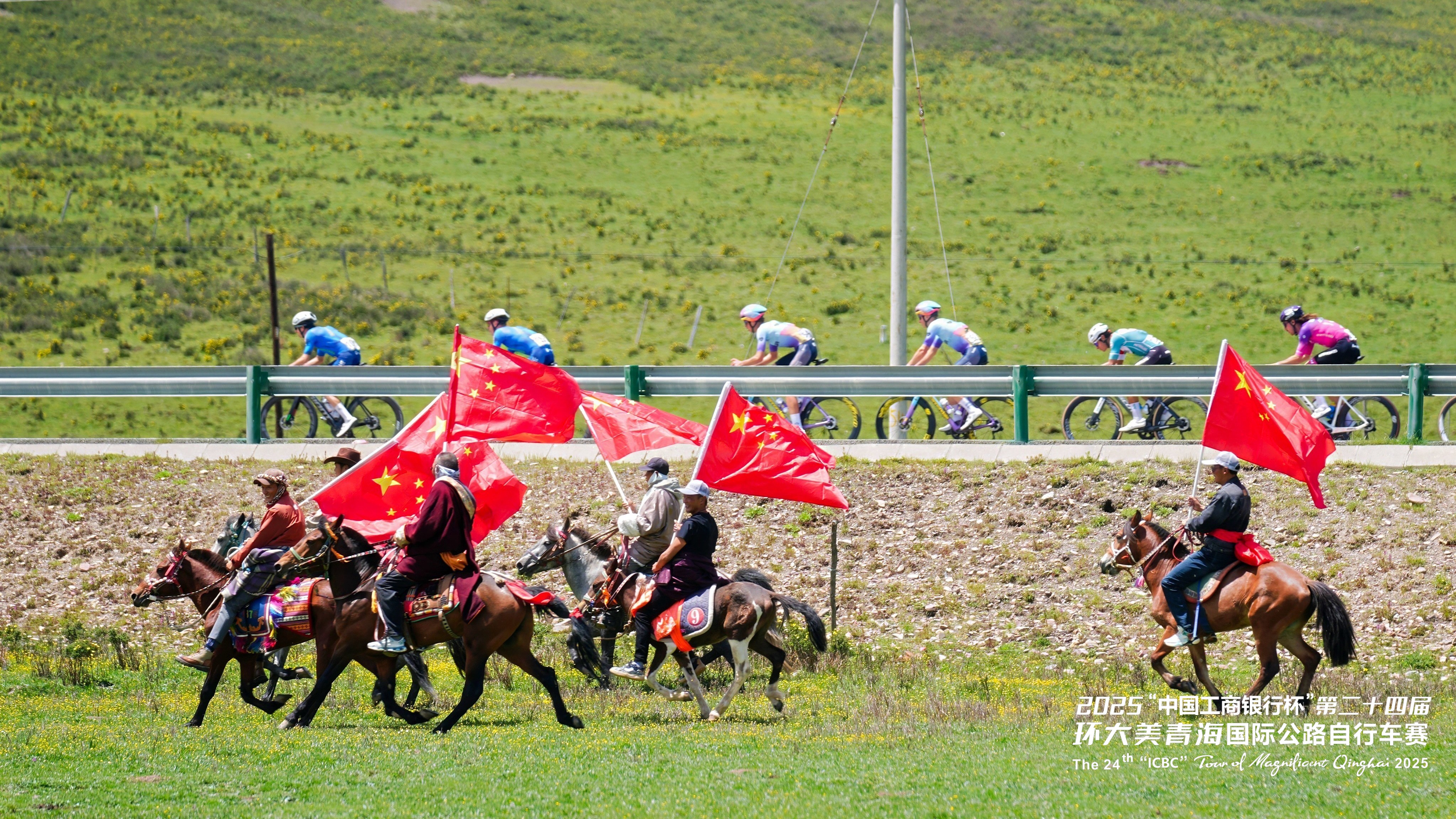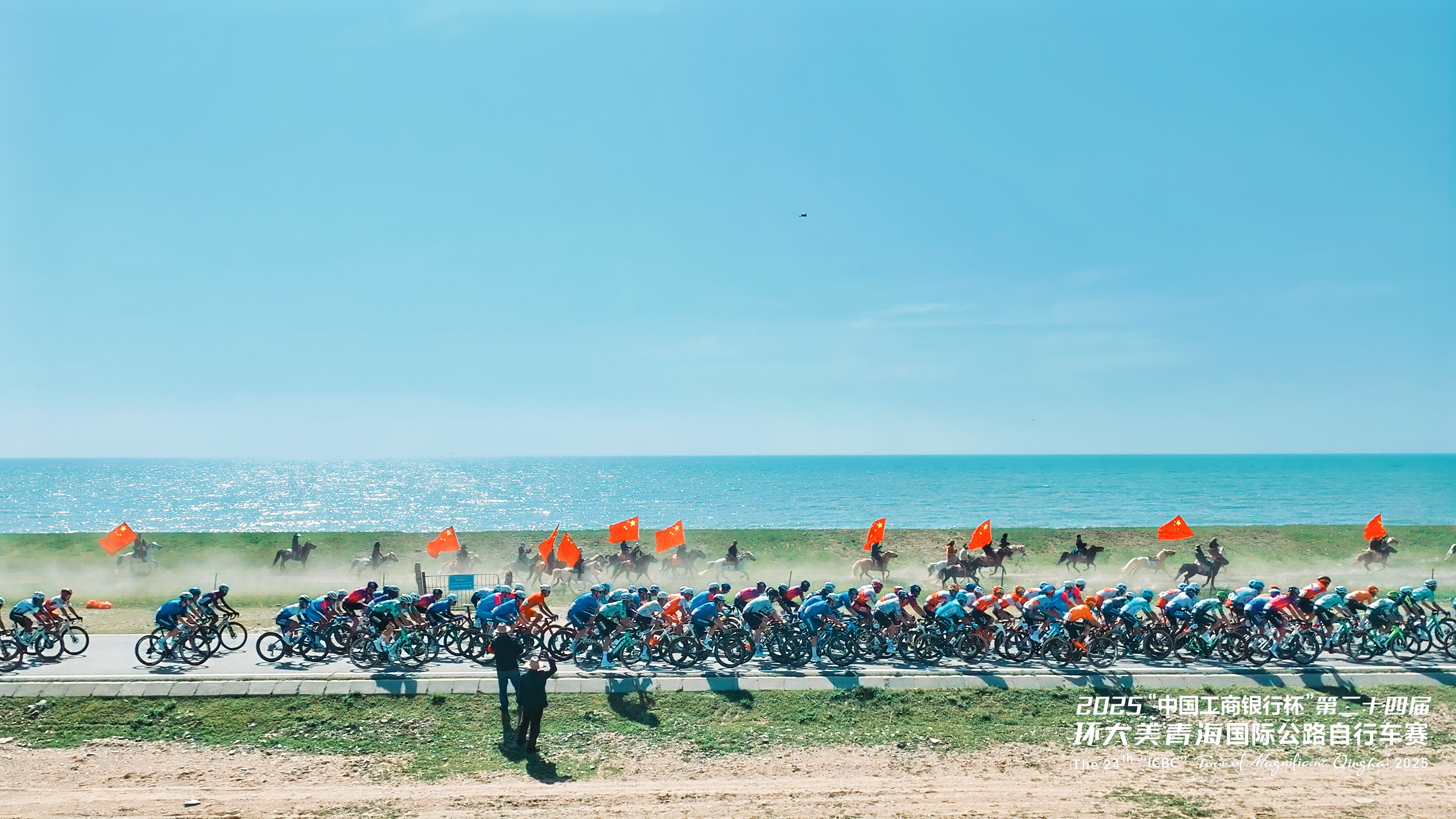 在青海湖畔,牧民們手擎國(guó)旗策馬飛馳,與選手們并肩競(jìng)逐。這一場(chǎng)景也致敬了全球頂尖自行車賽事環(huán)法自行車賽中自行車與馬匹同行的經(jīng)典畫面——騎馬承載著人類悠久的出行記憶,自行車則象征著現(xiàn)代的綠色出行理念,此刻,在青海湖畔,傳統(tǒng)與現(xiàn)代完美交融,共同譜寫著人與自然和諧共處的動(dòng)人篇章。