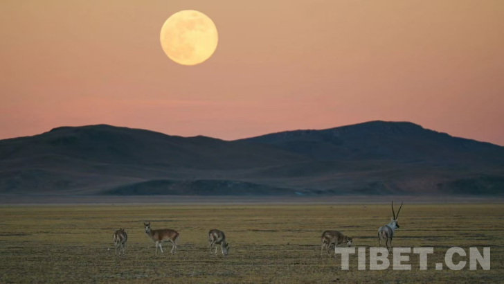 圖為藏羚羊群在草原上悠閑吃草