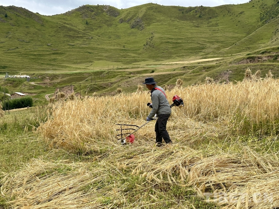 眼下,飽滿的青稞穗隨風(fēng)搖曳,村民們熟練地彎腰、揮鐮、捆扎,田間地頭呈現(xiàn)出一派繁忙景象。“今年雨水好,青稞長(zhǎng)得也比往年好?!币晃淮迕褚贿呅χ?,一邊向我們展示剛剛捆好的青稞麥堆。