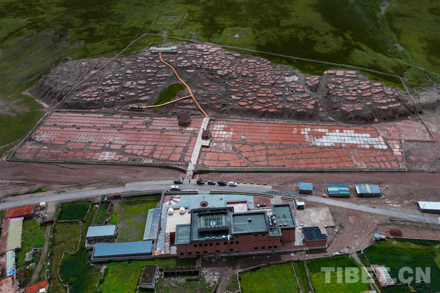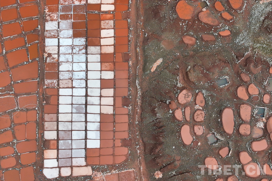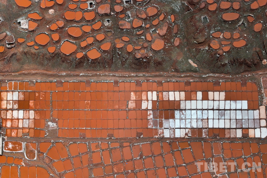 圖為航拍白扎鹽場(chǎng),這種紅褐色的顏色來自附近山體中所含的礦物質(zhì) 攝影:薛蒂