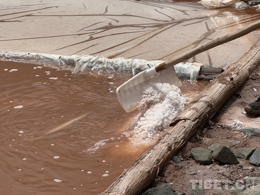 白扎鹽場(chǎng)出產(chǎn)的鹽有白鹽與紅鹽兩種,圖為江羊巴桑正在向我們展示白鹽的制取過程??梢钥吹?,盡管鹵水呈現(xiàn)較深的紅褐色,但初步制取的鹽仍然呈現(xiàn)雪白的顏色。攝影:畢然