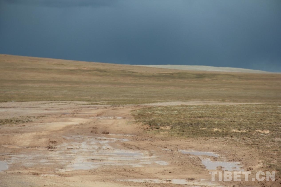 無人區(qū)的天氣是片段式的,前腳還晴著,下步走進(jìn)一塊雨云下,車子就又會被淋個透。我們的車就中招了,在一片黑云壓頂后,刷刷的小雨下了起來,不久又變成了冰雹。小小的冰塊砸在路上融化,很快就把干的泥土裹了起來,路上頓時變得泥濘不堪。如果說石子路的顆粒感顛得人頭暈,那么雨后泥路就黏黏糊糊的,車子仿佛在浸滿水的海綿上走,快不了,也起不來。漸漸地,雨水大起來,漸漸匯成小溪,車輛駛過,又是一片水花四濺。