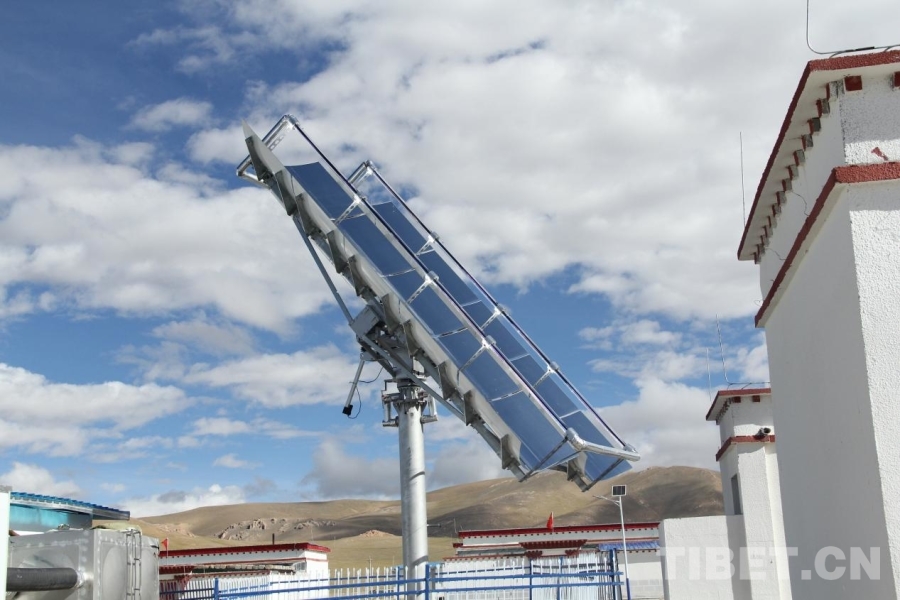圖為那曲申扎縣申扎鎮(zhèn)姜戎村新居點的巨大太陽能為村里澡堂供熱水 攝影:趙釗