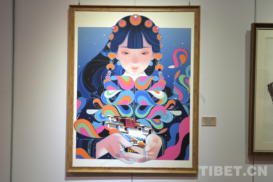 展覽現(xiàn)場,參展藝術家李旻的作品《虹光圣城》色彩絢麗,構思新穎,引得眾多觀眾駐足觀看。據(jù)介紹,本幅作品是一副綜合運用了現(xiàn)代藝術創(chuàng)作手段的數(shù)字繪畫,同時融入了如布達拉宮、藏裝等經(jīng)典的藏式元素,畫面生動,色彩鮮艷,形式新穎,展現(xiàn)了當代西藏藝術的傳承與創(chuàng)新,是本次展覽極具代表性的作品之一。