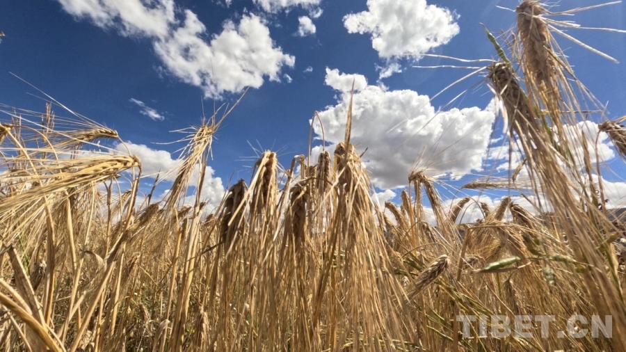 圖為藍天白云之下飽滿的青稞迎來成熟 攝影:德吉卓瑪