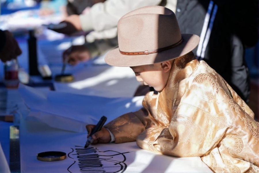 圖為參加匯報(bào)展的孩子在書寫藏文 主辦方供圖