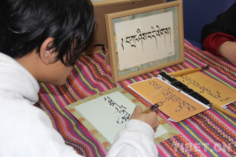 圖為同學(xué)們手拿傳統(tǒng)竹筆學(xué)寫(xiě)藏文