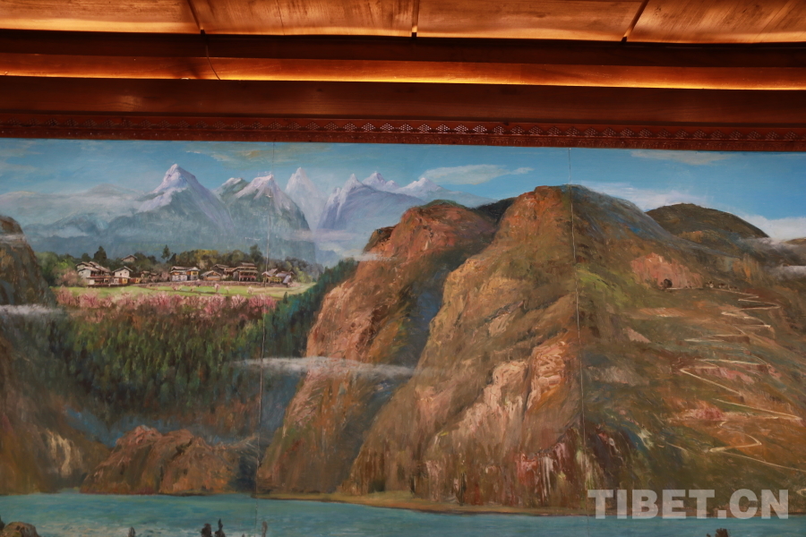 圖為色龍村內(nèi)建筑上的壁畫,生動描繪了色龍村所處的特殊地理?xiàng)l件,右邊的盤山公路蜿蜒通過隧道之后而有左邊的“桃花源” 攝影:王妍丹