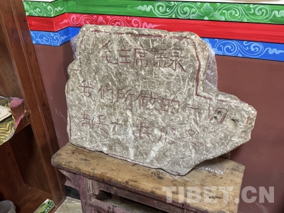 如今,松安寺內(nèi)有一座專門設立的紅色文物陳列室,長青介紹道,這座紅色文物陳列室是現(xiàn)任活佛羅讓甲央在當?shù)卣С窒禄I建而成。陳列室廣泛收集了有關紅色文物進行集中展示,供僧眾和信教群眾參觀學習。有一塊石刻被視為“鎮(zhèn)館之寶”,上面刻著毛主席的語錄“我們所做的一切都是為人民服務”。石刻是寺廟在維修僧房時從房基下發(fā)現(xiàn)而挖出的,年代久遠,也見證了歷史里精神的傳承。