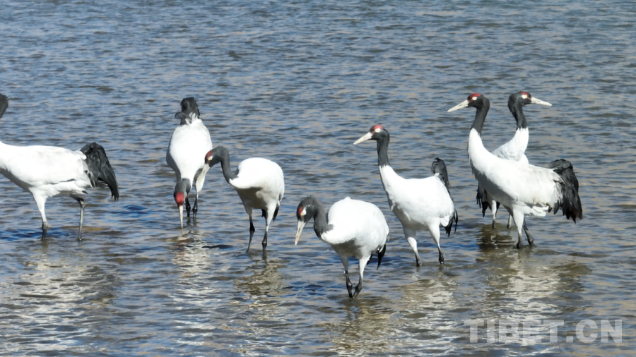 在南木林縣艾瑪鄉(xiāng)周邊,不少黑頸鶴陸續(xù)抵達(dá)并集群棲息,為越冬積蓄能量。它們或在河畔低頭啄食,或閑庭信步梳理羽翅,時(shí)而振翅舒展身姿。