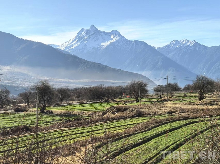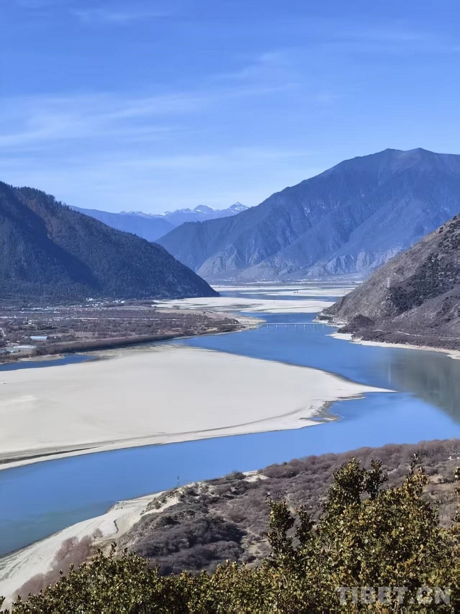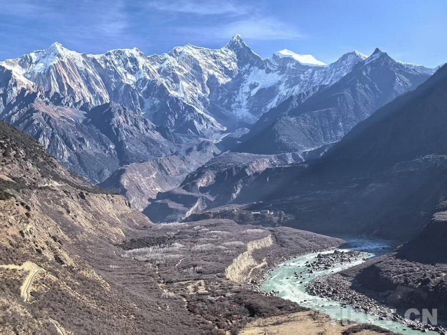 冬日,雅魯藏布大峽谷靜默如詩。江水凝為碧藍(lán)玉帶,蜿蜒穿行山間。驅(qū)車沿山路前行,掠過田舍與松林,驀然抬首,巍峨雪山撲面而來——陽光璀璨,峰巔銀光灼灼,在蔚藍(lán)天空下愈顯玉潔冰清。