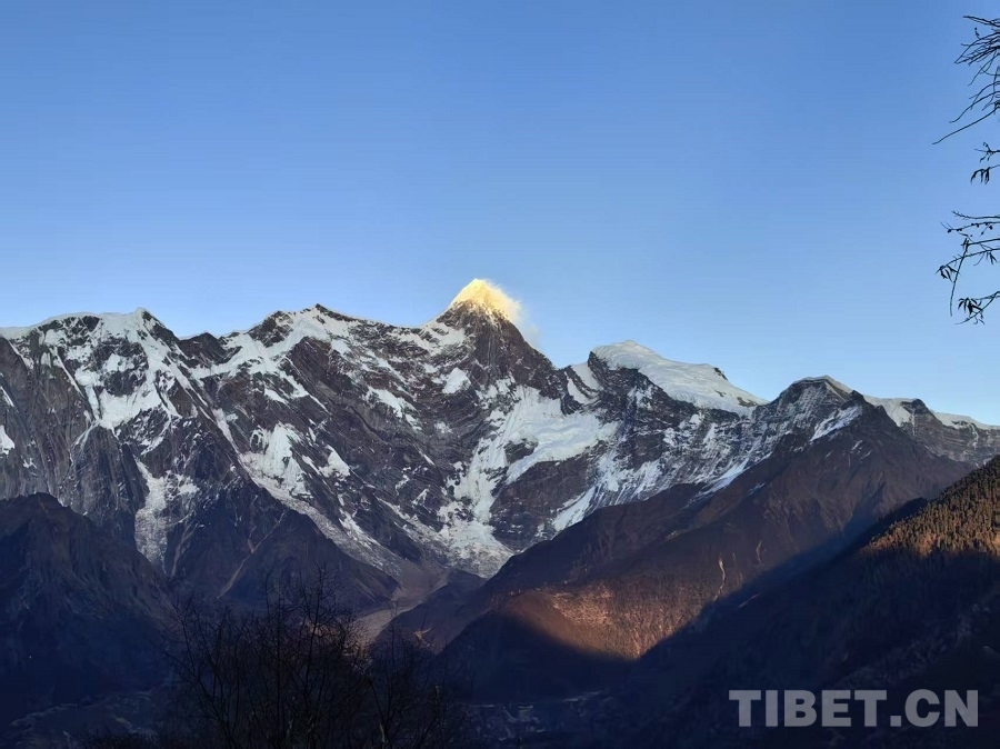 抵達(dá)江北臺(tái)地上的米林市派鎮(zhèn)索松村,四下極靜,連狗也慵懶。冬日的桃林枝干黝黑虬曲,客棧窗框恰好將南迦巴瓦納入其中。這座“羞女峰”唯有在冬日格外慷慨,終年云霧悄然散開,三角峰體全然顯露,陡峭決絕,雪色泛著亙古的金屬寒光。斜照之中,山體嶙峋的肌理清晰可辨,皺褶與陰影堅(jiān)硬而確鑿,令人頓生敬畏。