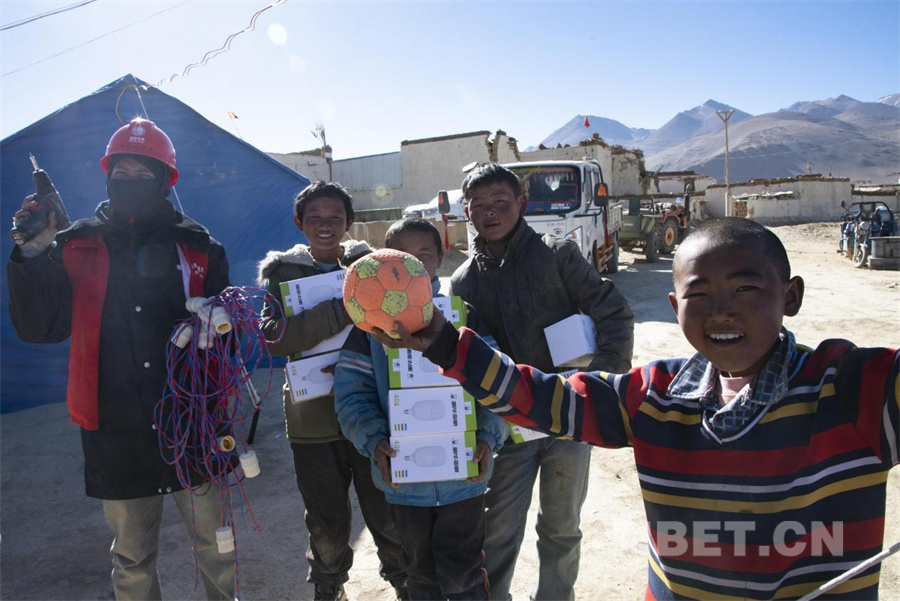 圖為地震發(fā)生第三日,在定日縣曲洛鄉(xiāng)措昂村國家電網(wǎng)工作人員為受災(zāi)群眾安置點(diǎn)通電,孩子們開心地加入工作人員的隊(duì)伍中隨時(shí)搭把手(攝于2025年1月9日) 攝影:趙振宇