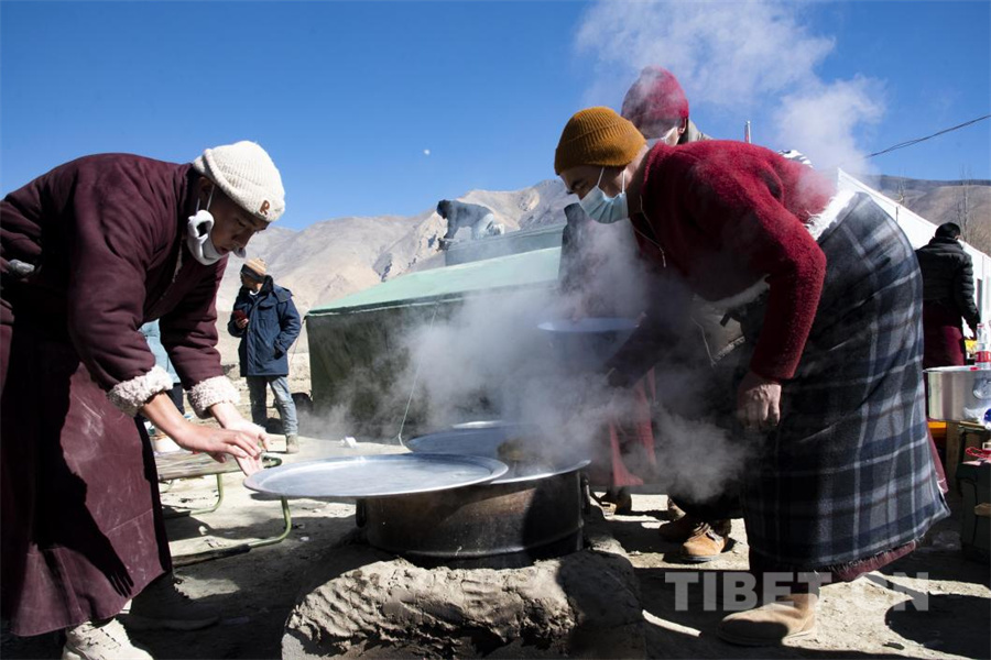 圖為震后第一個(gè)藏歷新年古突夜,在定日縣長(zhǎng)所鄉(xiāng)茶江村受災(zāi)群眾安置點(diǎn)里,村民扎西正在盛出熱氣騰騰的“古突”(攝于2025年2月27日) 攝影:趙振宇