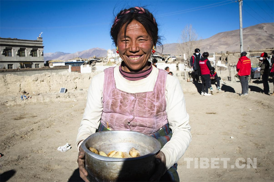 圖為在定日縣受災(zāi)群眾安置點(diǎn),受災(zāi)群眾拿出家中煮熟的最好的土豆給每一位“客人”分發(fā)(攝于2025年1月14日) 攝影:趙振宇