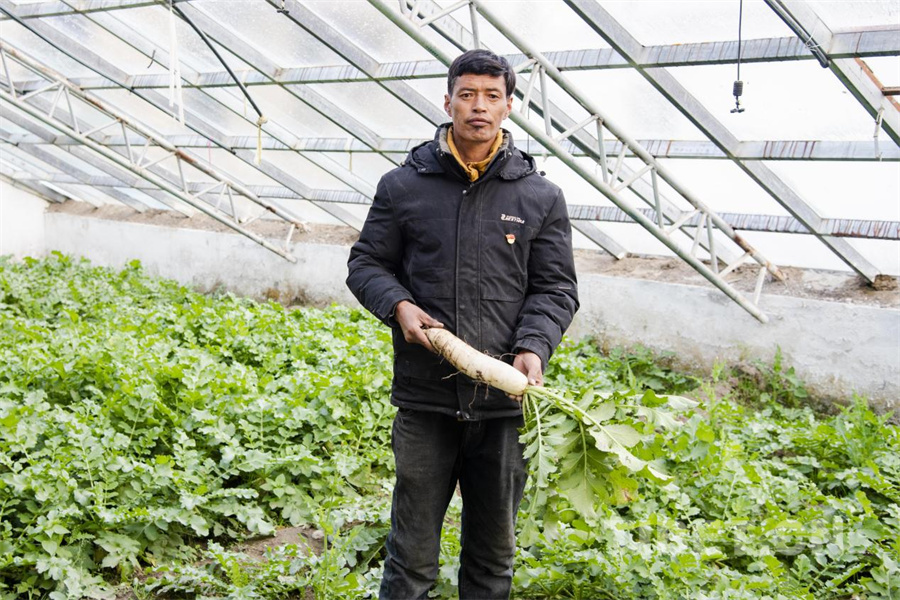 圖為定日縣長(zhǎng)所鄉(xiāng)嘎旦村村委會(huì)主任頓珠在震后修繕的蔬菜溫室大棚內(nèi)為記者展示棚內(nèi)種植出的白蘿卜(攝于2025年4月30日) 攝影:趙振宇