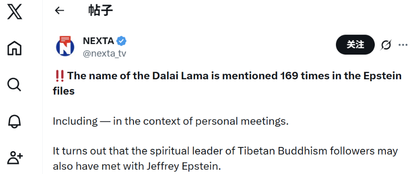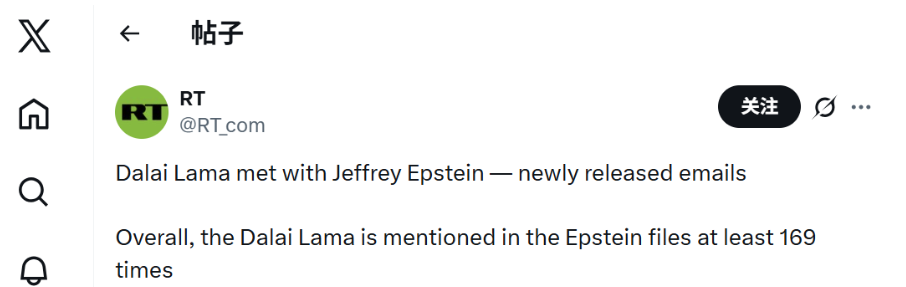 同日,“今日俄羅斯”(RT)在X上發(fā)布貼文稱,“達賴曾與杰弗里·愛潑斯坦會面——最新公布的郵件??偟膩碚f,在愛潑斯坦的文件中,達賴至少被提及169次”。