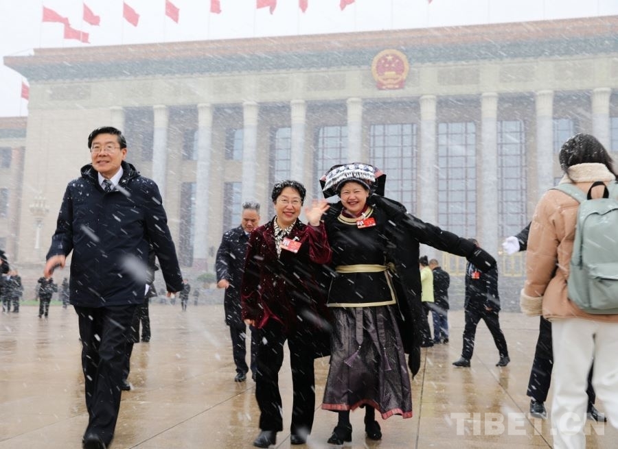 3月4日上午,十四屆全國人大四次會議舉行預備會議。會后,一場春雪不期而至。走出會場的全國人大代表、廣西金秀瑤族自治縣桐木中學副校長梁麗斌向記者們揮手致意。