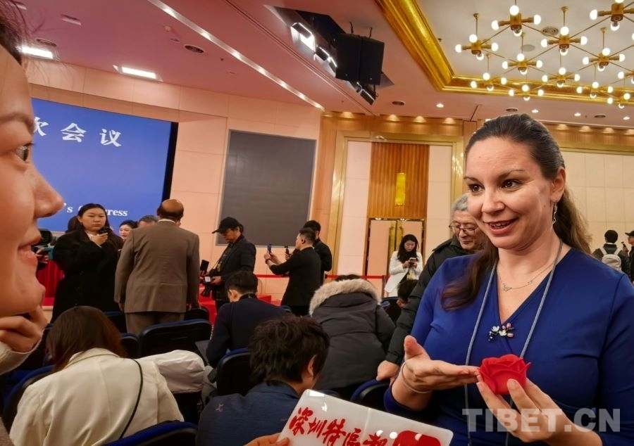 3月8日,在全國兩會新聞中心,來自玫瑰之國保加利亞的《言論報》記者塔尼亞·格盧赫切娃開心地收到了深圳特區(qū)報記者贈送的“三八節(jié)”禮物——一朵美麗的布藝紅玫瑰。
